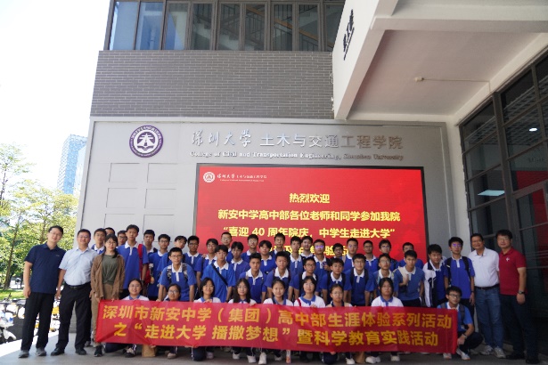 7月9日及11日,在深圳大学招生办和我院的组织下,深圳市新安中学(集团)高中部100余名师生、广东省肇庆市第一中学高一级摘星班的80余名师生来到我校进行参观交流。活动内容丰富多彩,包括校园宣讲、名师讲座、优秀学生分享互动、实验室参观及体验、生涯人物访谈等一系列丰富的活动。两所中学分别是广东省国家级示范性普通高中、广东省一级学校、广东省德育示范学校、广东省中小学心理健康教育特色学校、广东省高中教学水平评估优秀学校、广东省德育示范学校及肇庆市重点中学以及深圳市普通高中新课程新教材实施国家级示范区示范校(全市10所之一)。综合办学实力位居全市前列,学生综合素质高,是我校重要的优秀生源基地。
