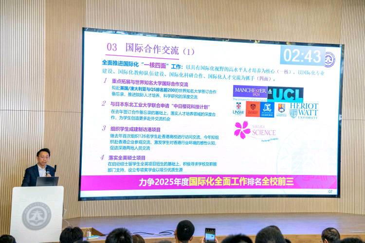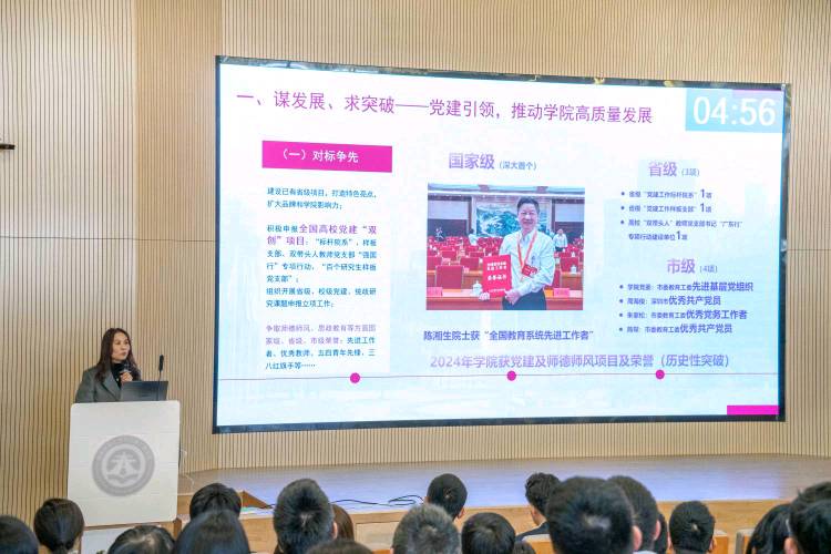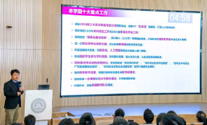 左英姿书记围绕“谋发展,求突破”、“强合规,防风险”、“优服务,聚人心”三组关键词,回答了在冲刺“双一流”的关键节点,学院党委如何赋能学科评估、推动学院高质量发展的关键问题。龙武剑执行院长从分管的行政工作、实验中心工作、国际合作工作以及学科建设工作四个方面分析了2025年的工作目标及预期成效,强调学院全体教职员工要上下齐心,全力冲击双一流。邹亮副院长围绕研究生及博士后工作的总体情况、存在问题,指出要贯彻落实新学位法,做好培养方案的修订,鼓励教学改革创新等。党委副书记陈碧霞从分管的学生工作、纪检工作、工会工作以及校友工作四个方面出发,部署2025年工作重点:推进学生党建与思政教育进社区,提质人才培养;强化教职工廉洁警示教育及监管机制;优化工会管理并开展"关爱自我"健康活动;凝聚校友力量支持学院发展。杨磊副院长从本科招生、培养、专业结构调整等方面分析了本学期的重点工作,指出学院应积极迎接技术变革,将信息化、人工智能等前沿内容融入每门课程。包小华副院长总结了2024年学院在师资队伍建设、人才引进与培养等方面取得的显著成效,指出2025年将继续内培外引高水平人才,形成高素质高效精干的教师队伍。郭峻副院长从基金申报、科研成果认定转化等具体工作要求入手,鼓励教师积极申报各类科研项目。他指出要完善科研成果认定与转化机制,加强政策培训,确保科研成果能够及时转化为实际应用。因丁志坤副院长有事未能参会,郭峻副院长代为传达了今年科研实验平台、后勤管理、招投标等工作计划,强调2025年将积极召开国家级科研平台座谈会,加强对外宣传,展示国家级科研平台建设成果。