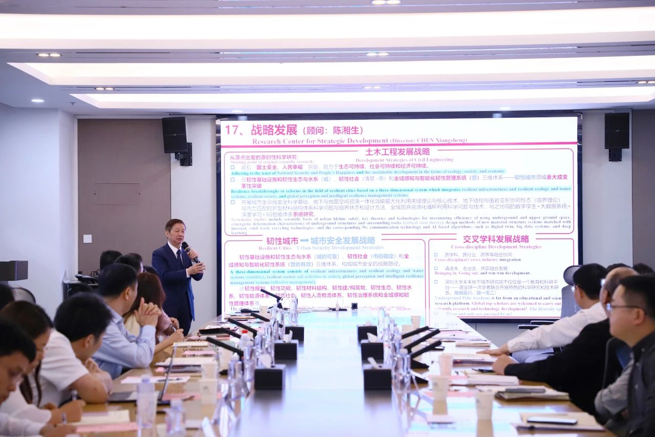 陈湘生院士首先对朱恩平局长一行的到来表示热烈欢迎和衷心感谢,并对深圳大学、土木与交通工程学院和未来地下城市研究院的发展历程、人才队伍建设、科研成果创新、项目成果情况以及未来发展规划等方面进行了介绍,重点分享了韧性城市(城的可靠、市的有序、管的有效)的前沿理念,以及数智土木工程的相关研究与应用前景。