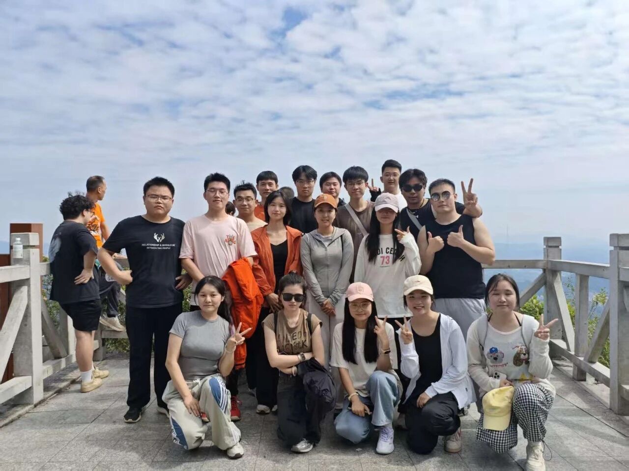 在经历了陡峭石阶的考验后,队伍成功登顶飞云顶。极目远眺,山峦起伏、城市轮廓尽收眼底,队员们也沉浸在这天高云阔的壮美景色中。登顶后开展的“云顶新声”交流环节,大家围坐畅谈研会愿景与学业规划,在思想碰撞中凝聚共识,锚定前行方向。