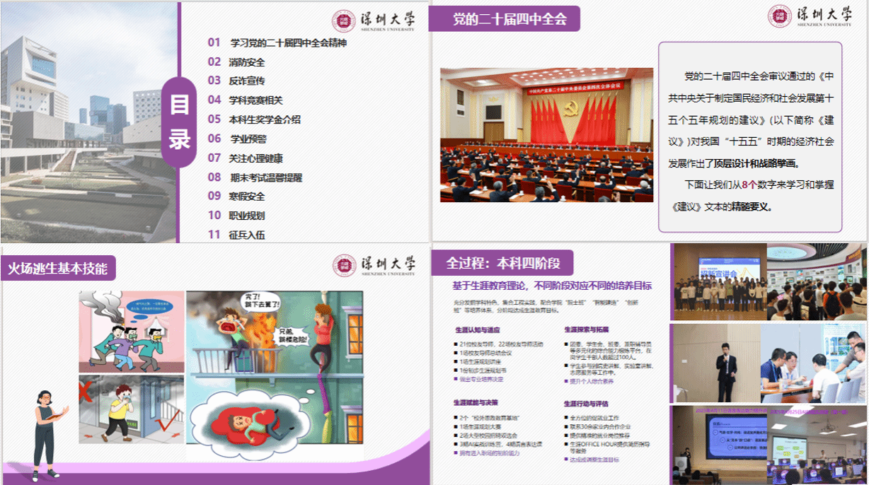 思想引领方面,各班级集中学习党的二十届四中全会精神,通过“8个数字”拆解“十五五”规划建议精髓,引导学生锚定家国发展方向,将个人成长融入时代大局;安全保障方面,聚焦消防安全、反诈宣传、寒假安全三大重点,以真实案例讲解等形式,切实筑牢学生安全防线;学业发展方面,详细解读学科竞赛、奖学金评定、学业预警等政策细则,重申期末考试纪律,强调诚信应考要求;成长规划方面,则围绕心理健康、职业规划、征兵入伍等学生关切问题,精准对接资源、明晰发展方向,为学生成长成才保驾护航。