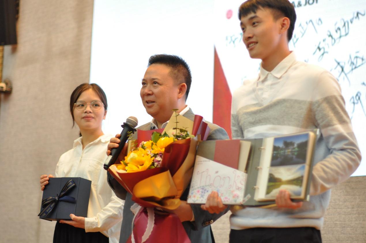 受资助学生代表陈上泉、陈丽梅同学上台给邓学勤先生赠送礼物,表达对邓学勤先生的感恩与感谢。