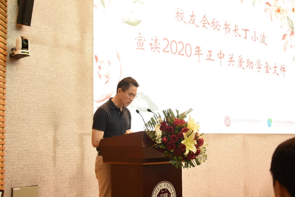 深圳市深大土木教育基金会秘书长丁小波老师宣读2020年正中关爱助学金文件。