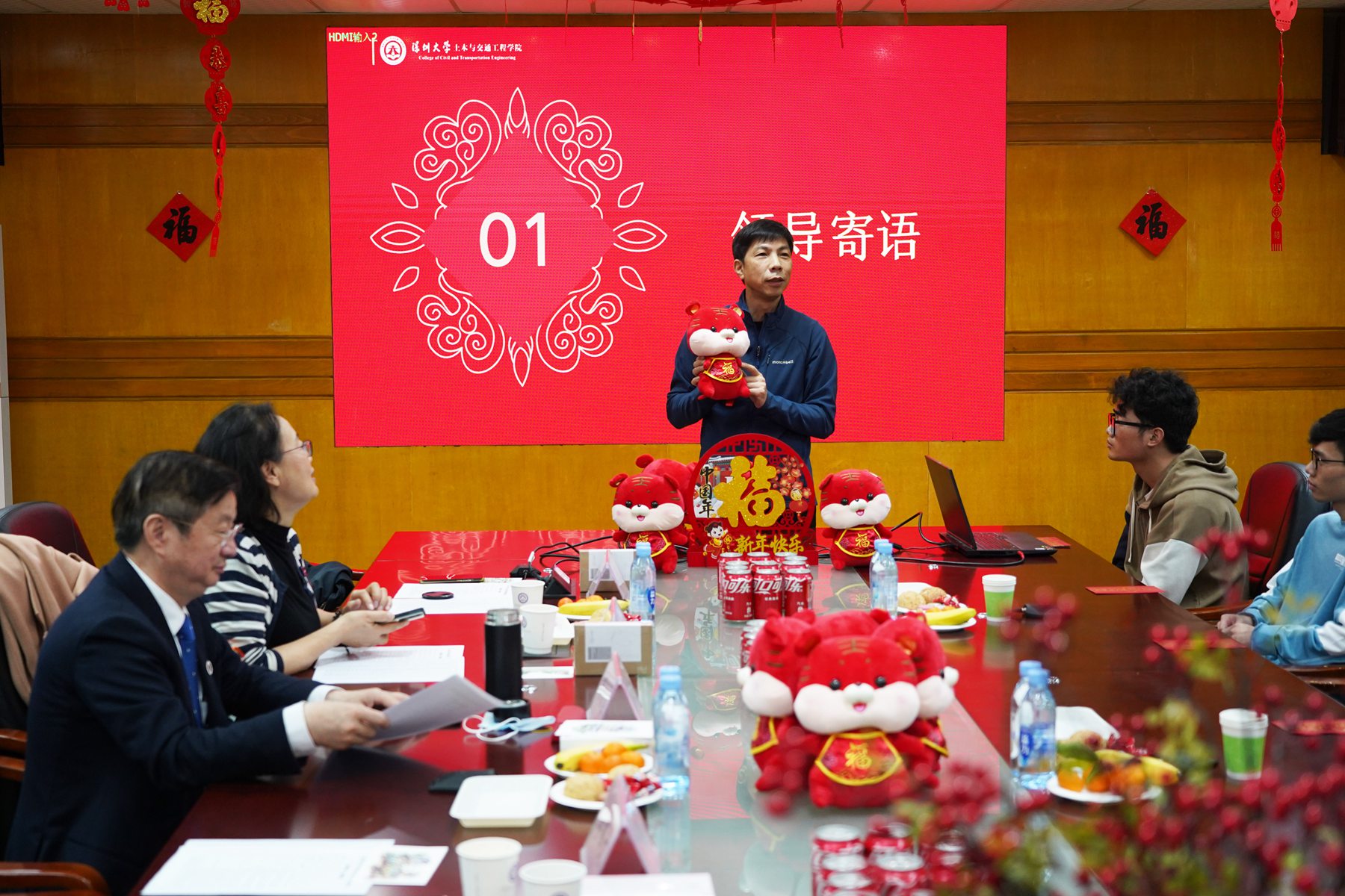 2022年1月26日下午,中国工程院院士、土木与交通工程学院院长陈湘生,学院党委书记李伟文,学院副院长隋莉莉,学院党委副书记陈碧霞,学院副院长杨磊,学院院长助理梅柳等学院领导和教师,一同来到粤海校区汇典楼二楼会议室,关心慰问我院寒假留校学生,并向他们致以美好的新春祝福,参加本次活动的留校学生共有50余人。本次茶话会为留校学生准备了茶歇、纪念品,现场张灯结彩,年味十足,整个会场给人一种辞旧迎新、蓬勃向上的新年氛围。