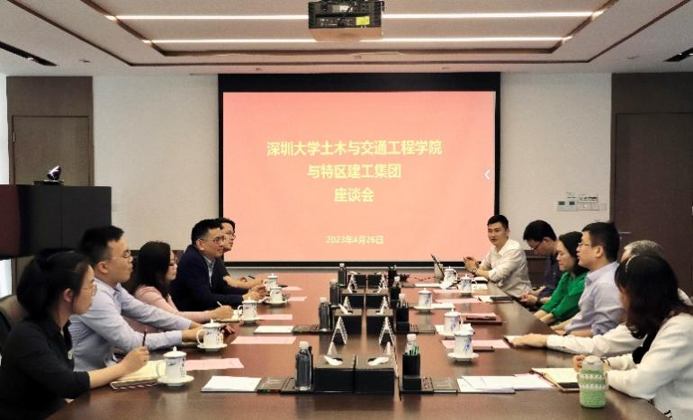 2023年4月26日下午,深圳大学土木与交通工程学院党委副书记陈碧霞、土木工程系主任周海俊、土木工程系副主任孙晓辉、土木工程系副主任熊琛、土木土木系教师郭孟环一行赴深圳市特区建工集团有限公司参观访问,并开展校企合作交流座谈会。深圳市特区建工集团有限公司党委副书记、工会主席孙凯,特区建工集团总工程师江建、路桥集团党委副书记孙岩、特区建工集团人力资源部副总经理朵美、特区建工集团工程技术中心副主任范璐璐等出席座谈会。