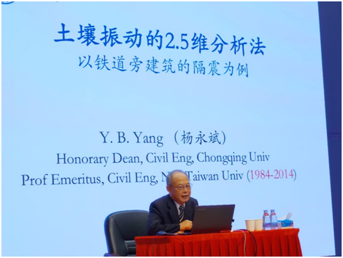 报告会上,杨永斌院士用简明清晰的逻辑、生动有趣的语言,深入浅出地向在场师生介绍了一种用于土壤振动分析的2.5维有限元/无限元法,并以铁道旁建筑物的隔震为例,介绍了该方法在隔震沟渠参数设计上的应用。