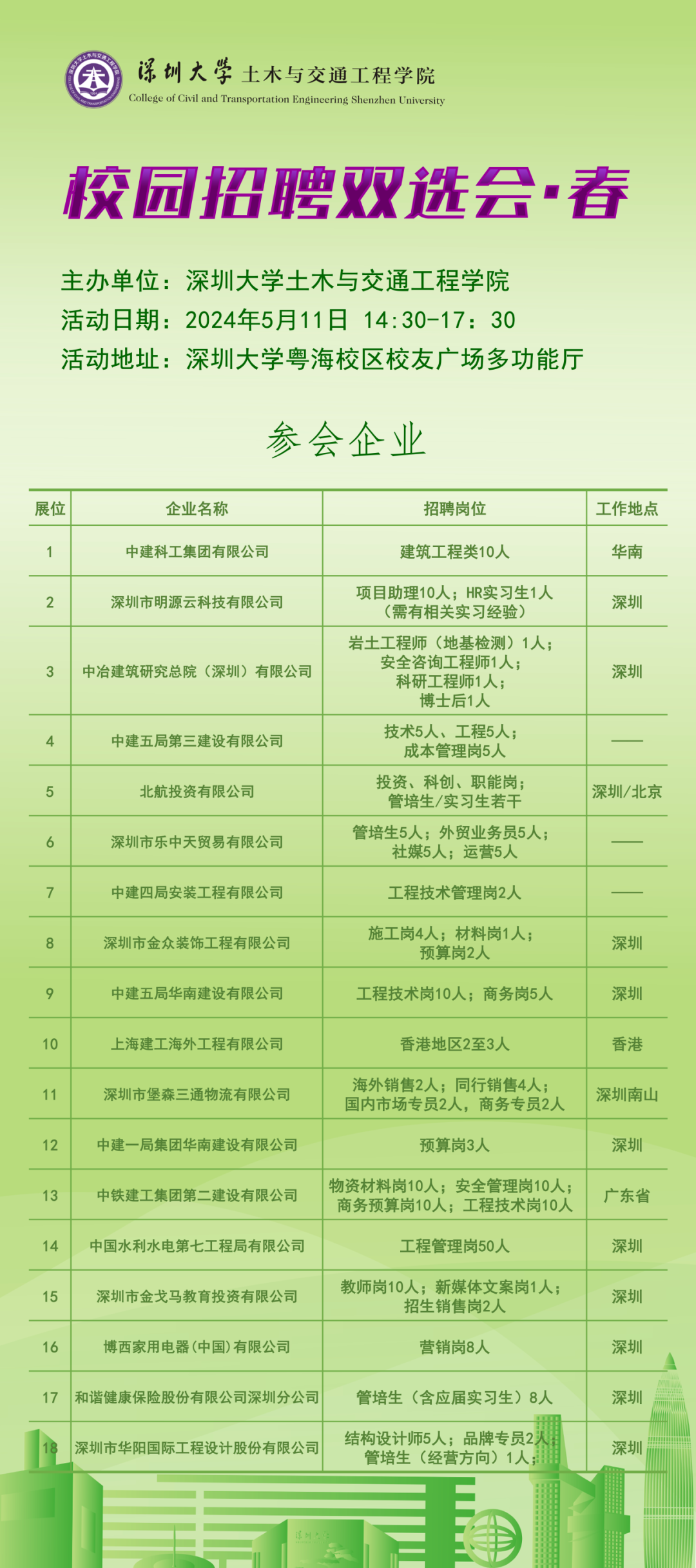 2024年春季招聘工作正在如火如荼地推进中。为了进一步帮助同学们了解企业,促进就业,我院将于5月11日举办2024年春季校园招聘双选会,为同学们与用人单位搭建一个增进相互沟通的平台。