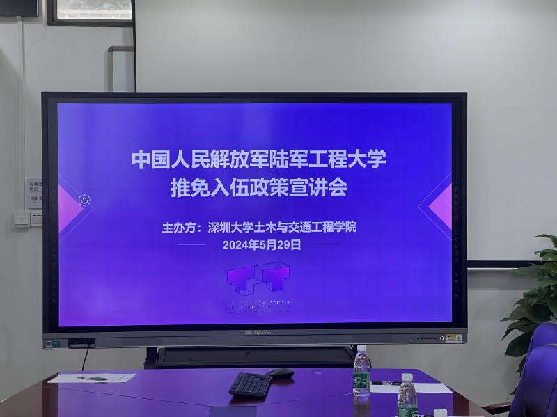 报国学子意,戎装赤子心。近年来,随着军队改革的持续推进,不少部队高校研究生招生政策有所改变,携笔从戎、参军入伍也成了更多学子的深造选择。为了让更多同学了解军人研究生的推免政策,5月29日中午,深圳大学土木与交通工程学院在致工楼B506会议室召开中国人民解放军陆军工程大学推免入伍政策宣讲会。本次活动主要面向学院大二、大三有意向推免到陆军工程大学读研(入学授军衔,身份为军人研究生)的同学,宣讲会由陆军工程大学爆炸冲击防灾减灾国家重点实验室李治中副教授主讲,我院副院长邹亮、党委副书记陈碧霞、辅导员潘文龙出席。