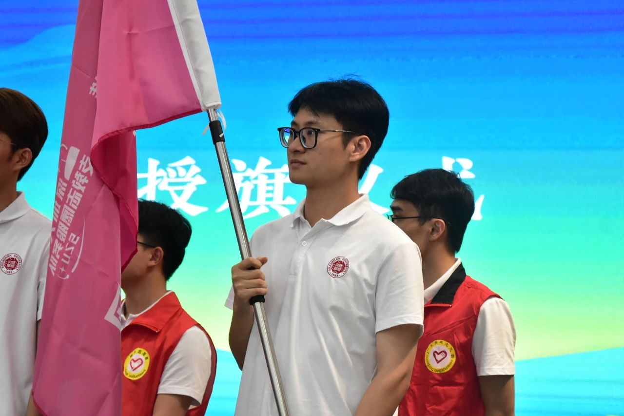 4名支教志愿服务队代表上台签署《暑期社会实践安全承诺书》。同时,与会领导为22支深圳大学支教志愿服务队举行授旗仪式。我院“砼心相伴支教实践团”队长文帝霖同学作为代表接受旗帜。