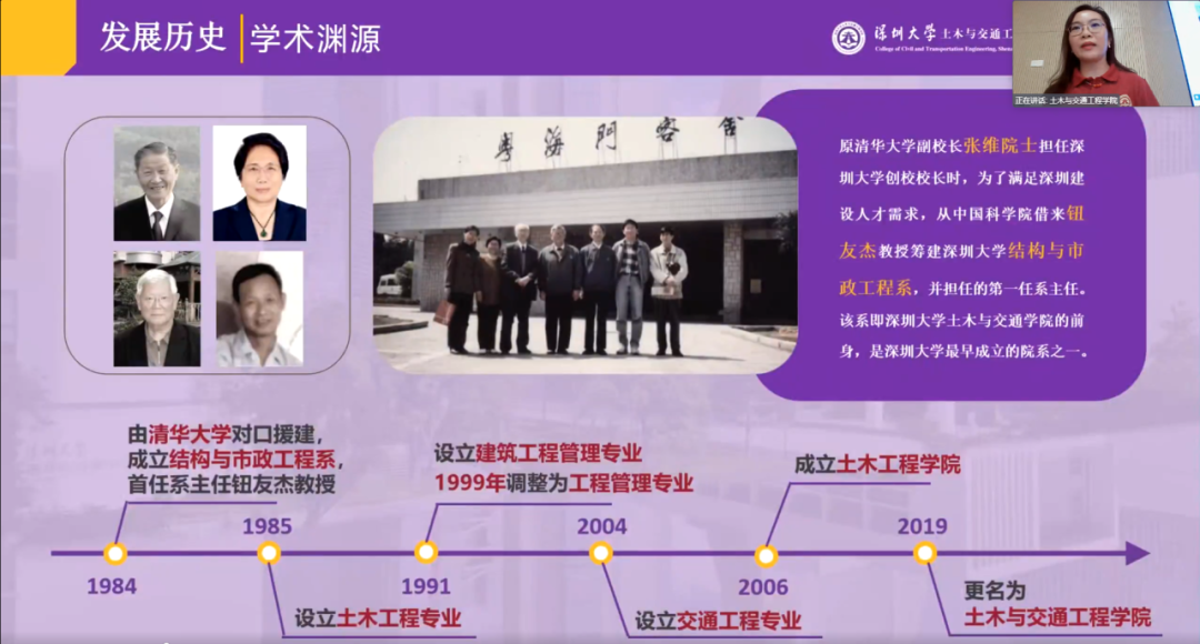 会议伊始,学院党委副书记陈碧霞带领与会人员共同回顾了深圳大学的建设背景以及土木与交通工程学院专业渊源与发展历程。深圳大学从最开始的几十人到如今的将近45000人的在校生规模,建校41年,锐意改革,快速发展;今年是深圳大学土木与交通工程学院办学的第40年,在这个过程中,学院始终秉持“夯土筑诚、励木至臻”的院训,脚踏实地,一路发展壮大。