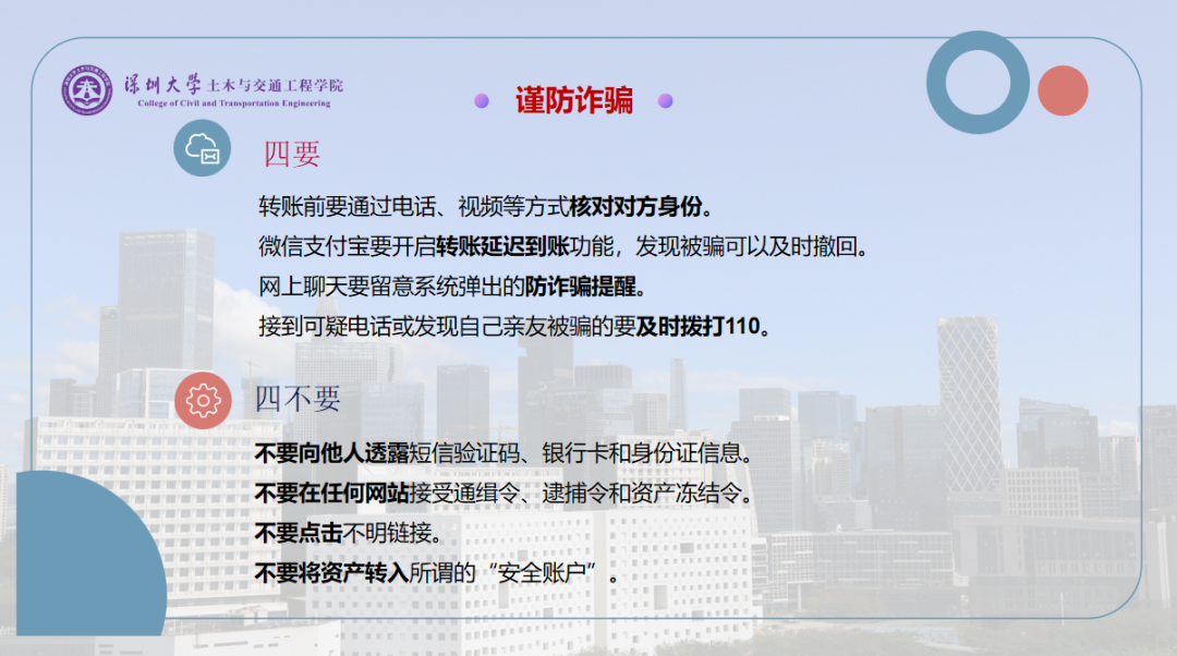 同学们通过诈骗案例,了解常见的诈骗手法,同时提醒同学们务必下载国家反诈中心APP加强防范。再次通过“四要”和“四不要”让同学们牢记诈骗的防范措施。