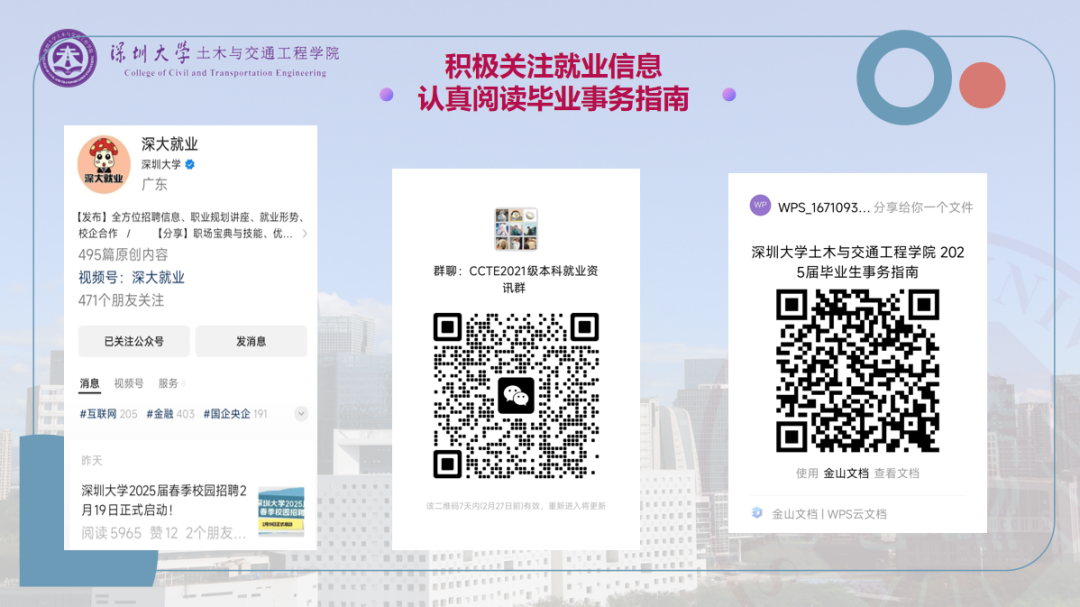 同时,提醒大家关注“深大就业”公众号,扫码加入“CCTE2021级本科就业咨询群”,收藏“2025届毕业事务指南”。