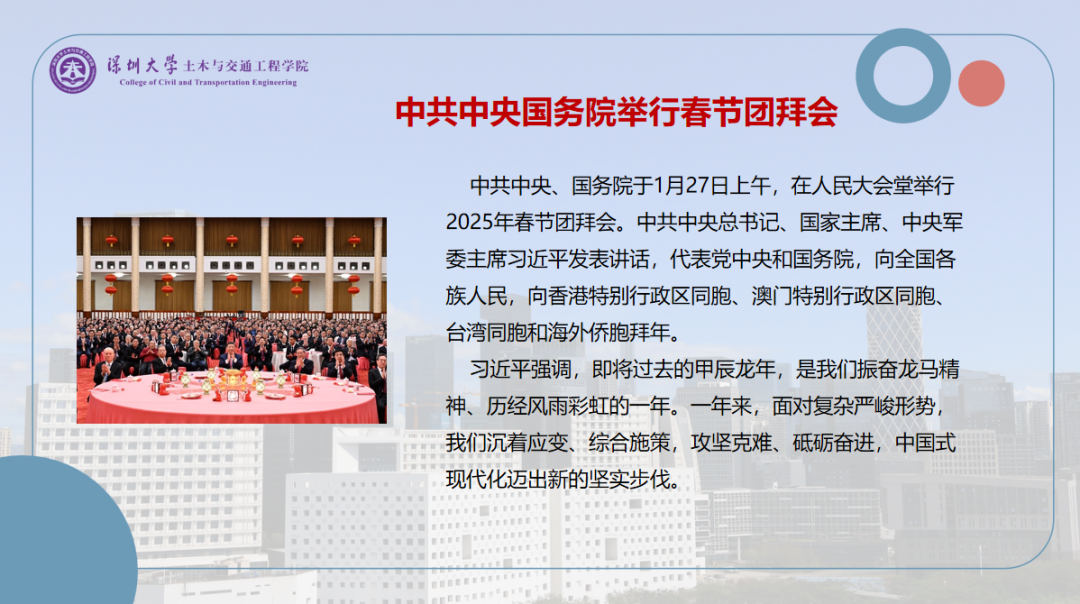 中共中央、国务院于1月27日上午,在人民大会堂举行2025年春节团拜会。中共中央总书记、国家主席、中央军委主席习近平发表讲话,代表党中央和国务院,向全国各族人民,向香港特别行政区同胞、澳门特别行政区同胞、台湾同胞和海外侨胞拜年。
