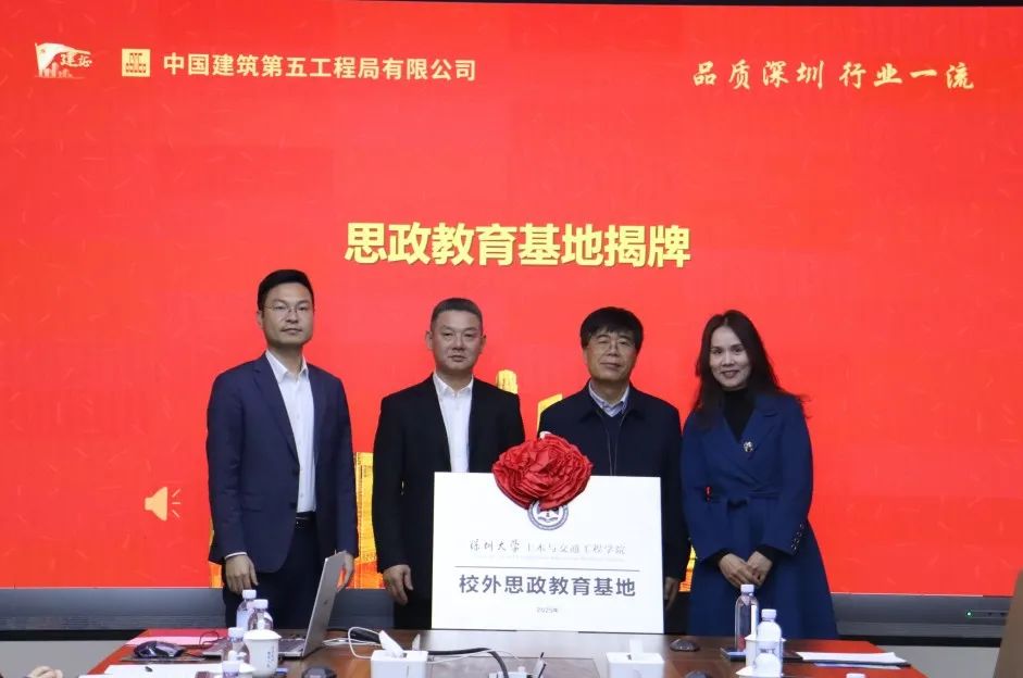 为进一步促进校企协同育人,深圳大学土木与交通工程学院与中建五局华南公司现场签订“校外思政教育基地”协议,并完成揭牌仪式。签约仪式上,双方分别介绍学校情况和企业情况,并共同观看宣传片。土木与交通工程学院2018届、2019届、2024届3位校友作为代表分享了自己在中建五局华南公司的职业生涯成长感受。