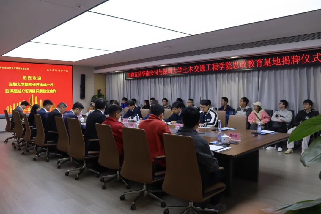 汪永成副校长对中建五局华南公司开展的党建共建、校园招聘等工作表示赞赏和感谢,认为土木与交通工程学院在中建五局华南公司建立的“校外思政教育基地”将促进校企双方优势互补、相互促进、合作共赢,为深大学子提供思政教育、专业学习、实习就业、志愿服务的全新平台。