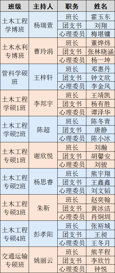 班会上,同学们纷纷进行了生动有趣的自我介绍,初步相识并成功破冰,彼此间的了解也逐步加深。本次班委选举采取自愿报名、上台演讲及投票选举的方式,遵循了自愿、公平、公开的原则。同学们踊跃参与竞选,各班均顺利地选出了班长、团支书及心理委员。下表为各班班会主持人及班委名单,恭喜以下同学当选!