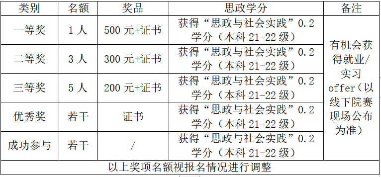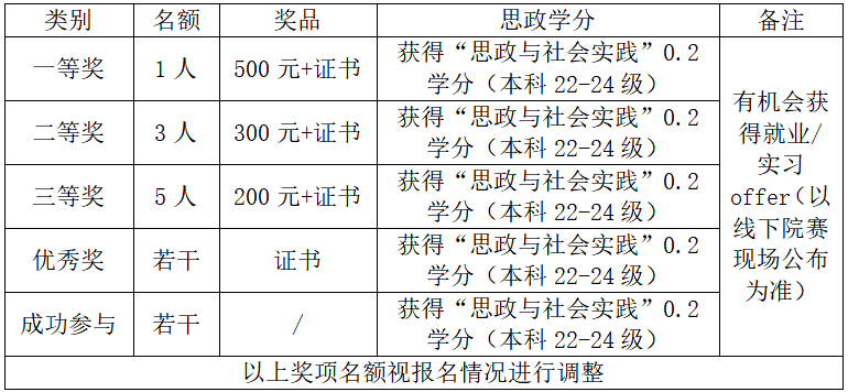 校级金奖3个:授予奖牌、获奖证书、奖金800元;可获得实习offer(以校决赛现场公布为准)。后续学校将继续为晋级省赛和国赛的参赛选手提供参赛支持及现金奖励(国赛金奖10000元、银奖5000元、铜奖3000元;省赛金奖3000元、银奖1500元、铜奖1000元)。