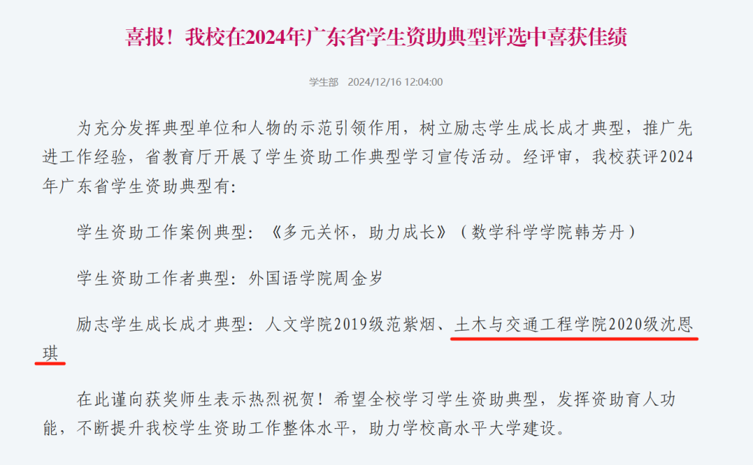 我们向沈恩琪同学表示最热烈的祝贺,并对她未来的学习和生活寄予最美好的祝愿。期待同学们都能以沈恩琪同学为榜样,秉承深圳大学“自立、自律、自强”的校训精神,土木与交通工程学院“夯土筑诚、砺木至臻”的院训精神,脚踏实地,自强不息,成为社会的栋梁之才!