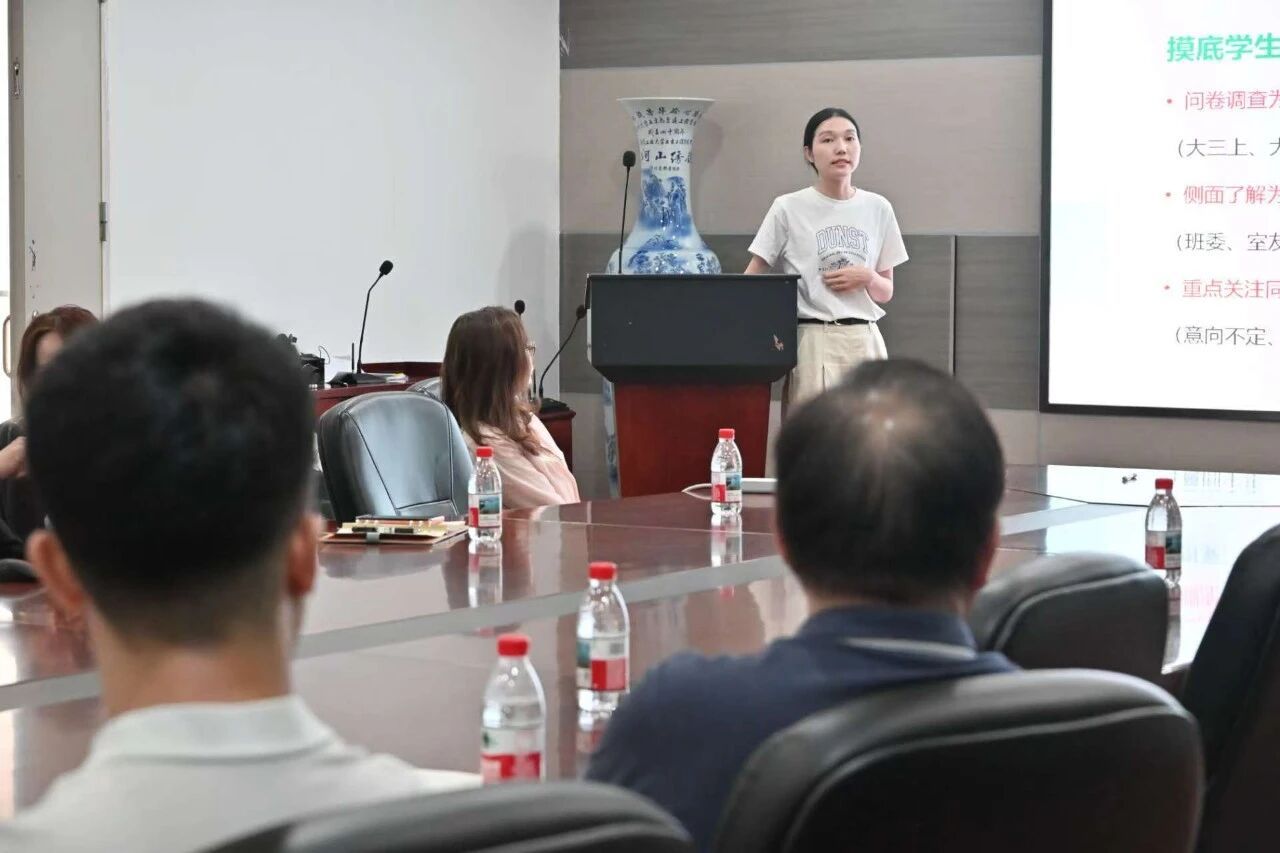 2021级本科生辅导员王青静分享了2025届本科生就业工作经验。她谈到,促就业工作本质是育人工作。就业工作是场持久战,更是场合作战,离不开全体班主任、学工团队以及学生骨干的共同努力。