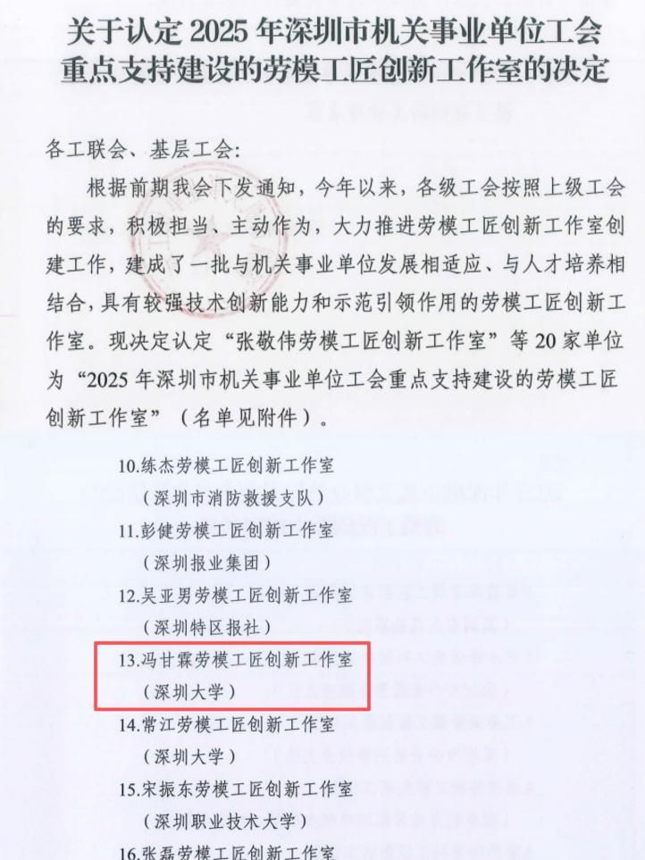 为表彰先进、树立榜样,充分发挥劳模和工匠人才在机关事业单位发展中的示范引领作用,深圳市机关事业单位工会认定一批“2025年深圳市机关事业单位工会重点支持建设的劳模工匠创新工作室”。我院“冯甘霖劳模工匠创新工作室”凭借扎实的创新基础和丰硕的研发成果成功入选。这一荣誉不仅是该团队辛勤付出与创新成果的高度肯定,更是对我院在劳模工匠培养、创新工作推进方面的充分认可。
