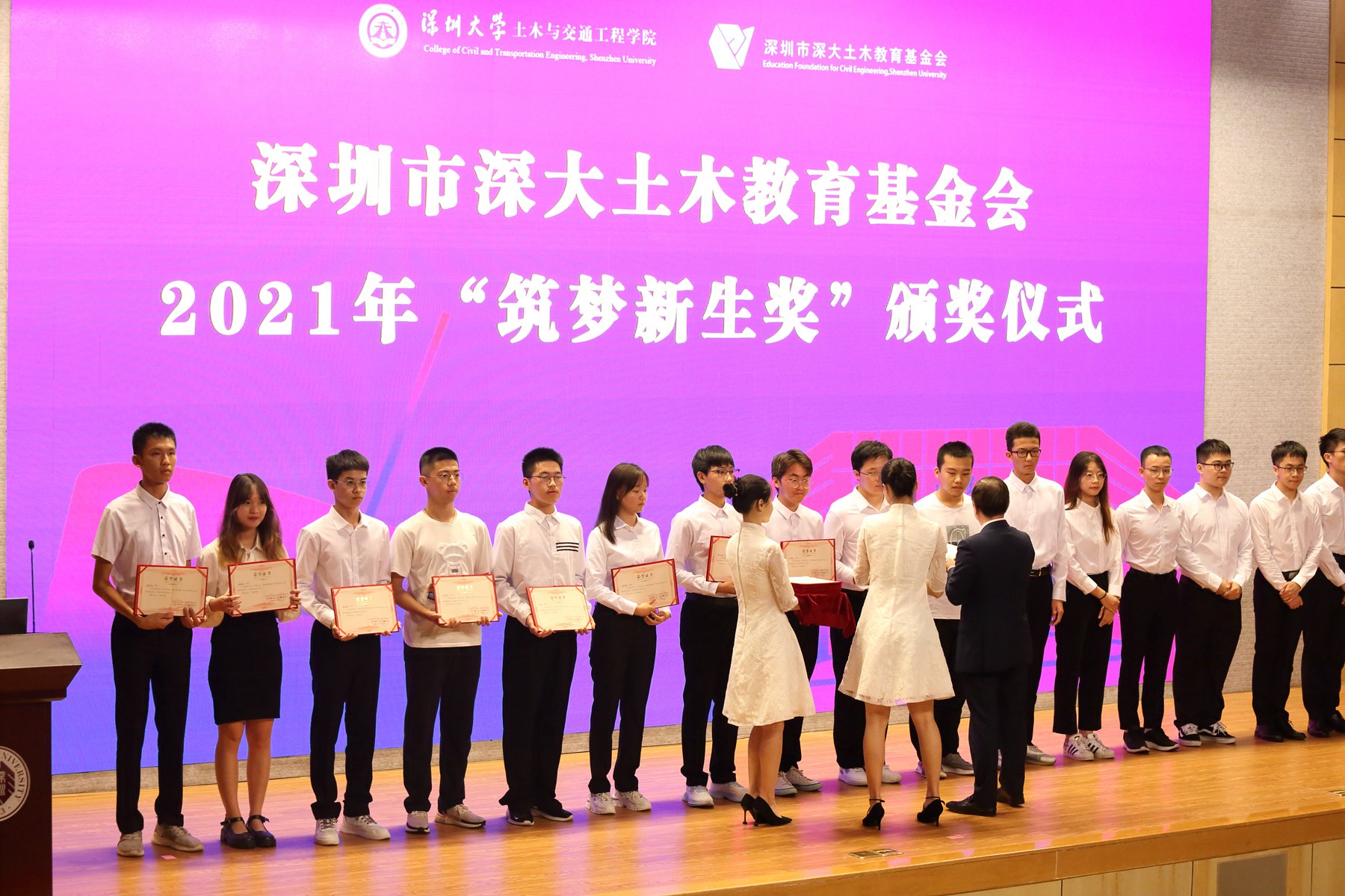 2021年9月29日晚6时30分,深圳市深大土木教育基金会2021年“筑梦新生奖”颁奖仪式在深圳大学汇星楼一号报告厅隆重举行。中国工程院院士、深圳大学土木与交通工程学院院长陈湘生院士,学院党委书记、深圳市深大土木教育基金会理事长李伟文教授,学院执行院长龙武剑教授,学院副院长隋莉莉教授,学院副院长邹亮教授,学院副院长杨磊教授,学院党委副书记陈碧霞老师,1996级校友、深圳市深大土木教育基金会党支部书记林峰智,1998级校友、深圳市深大土木教育基金会土木校友爱心基金委员会委员林爱莲等领导嘉宾受邀出席,参加本次颁奖仪式的还有学院教职工代表及2021级全体新生。