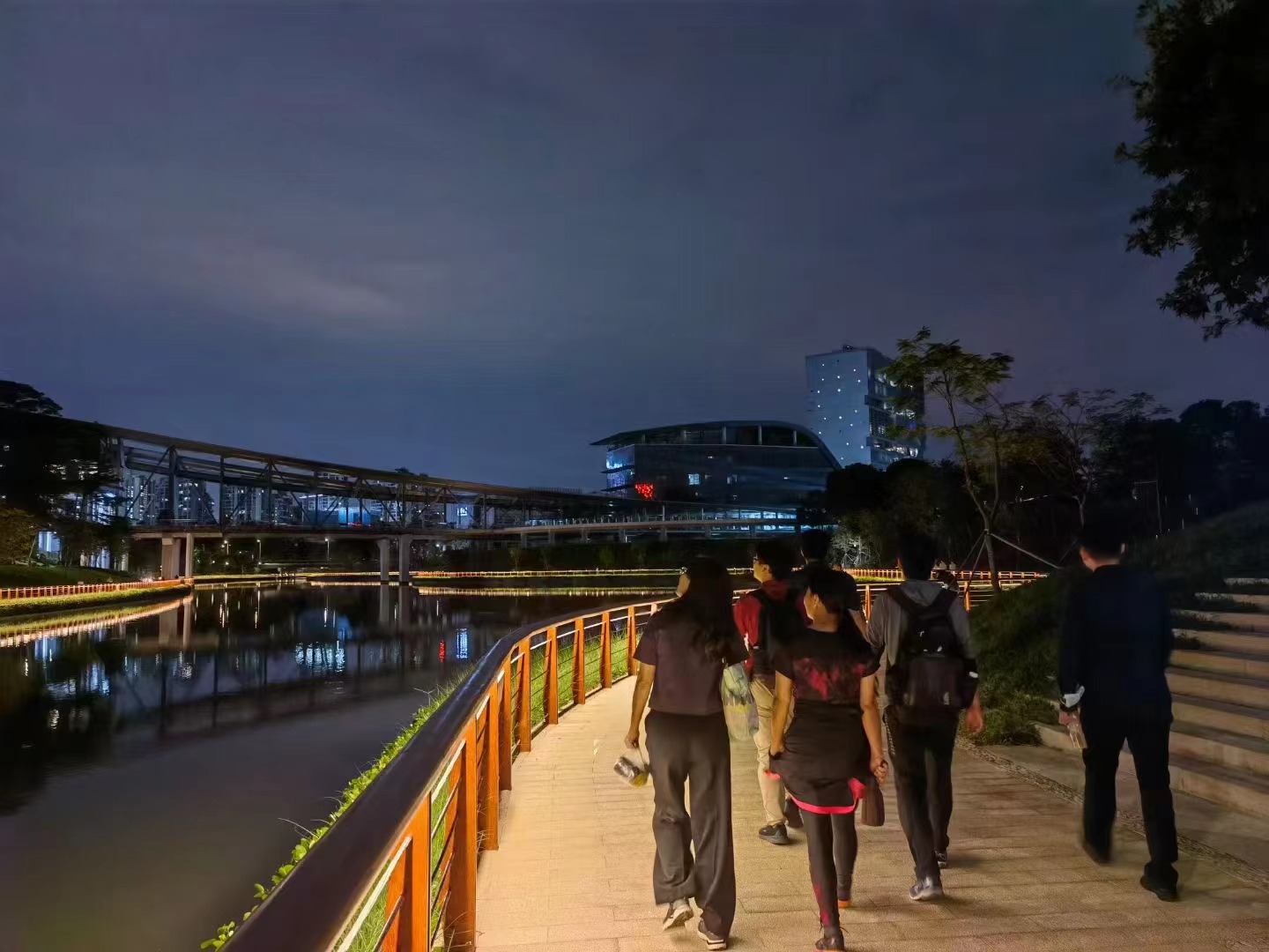 晚餐结束后,教职工们开启了大沙河徒步夜行之旅。徒步过程中教师们欢声笑语,一路上或闲庭信步相互聊天;或欣赏河畔鲜花、城市灯光;或坚持走完全程,甚至跑步奔向深大沧海校区学院院馆......