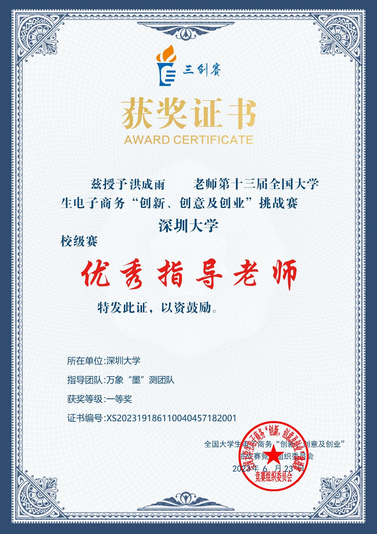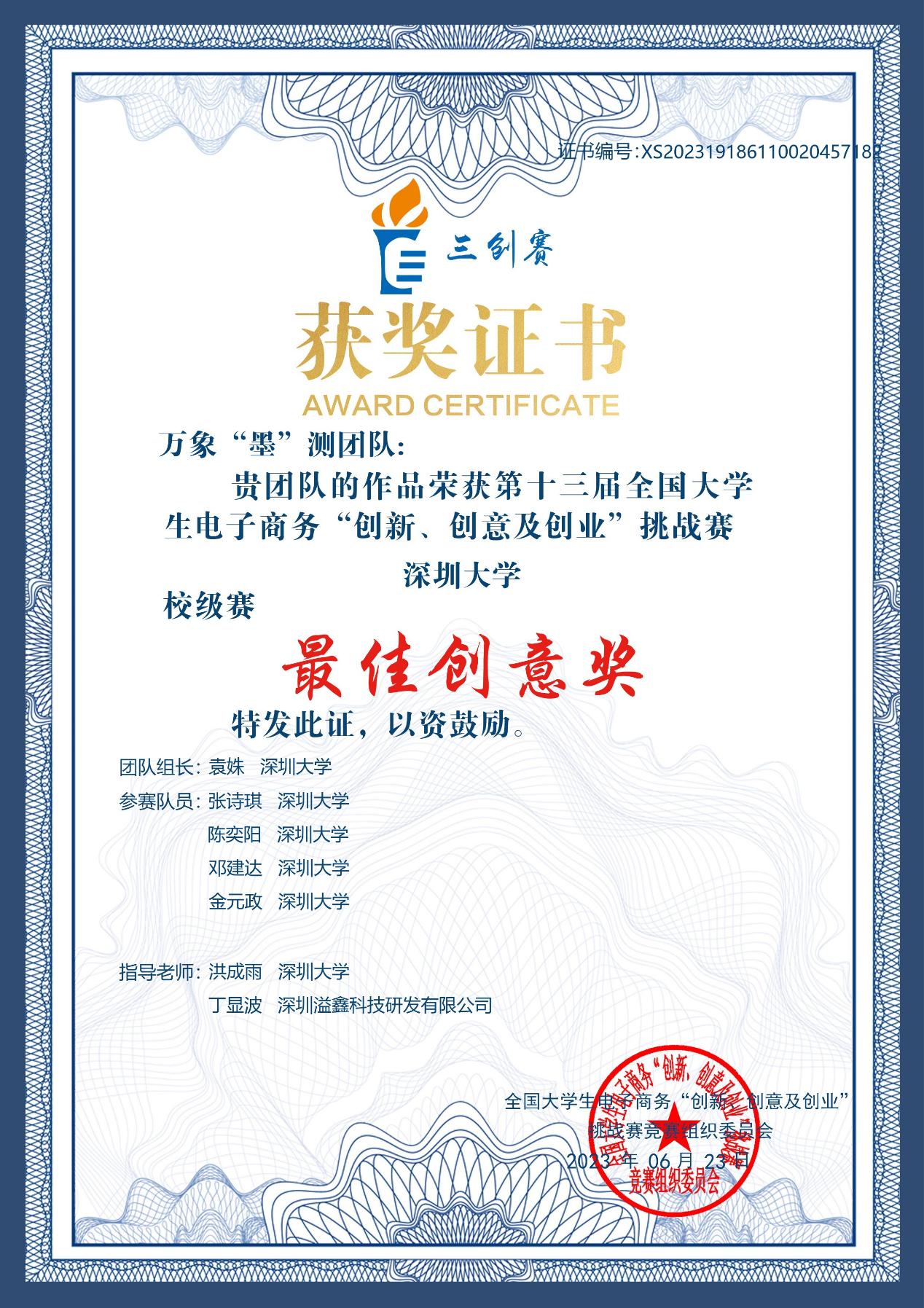 2023年6月10日,深圳大学土木与交通工程学院获得了第十三届全国大学生电子商务“创新、创意及创业”挑战赛(以下简称三创赛)一等奖和最佳创意奖,代表队成员:袁妹、邓建达、金元政、张诗琪、陈奕阳。指导教师洪成雨老师获得了“优秀指导教师”称号。本次赛事展现出荔园学子勇于拼搏的特区学子风采,也展示了土木与交通工程学院多年来在科研创新和教学融合、新工科人才培育、科研反哺教学的教学理念。