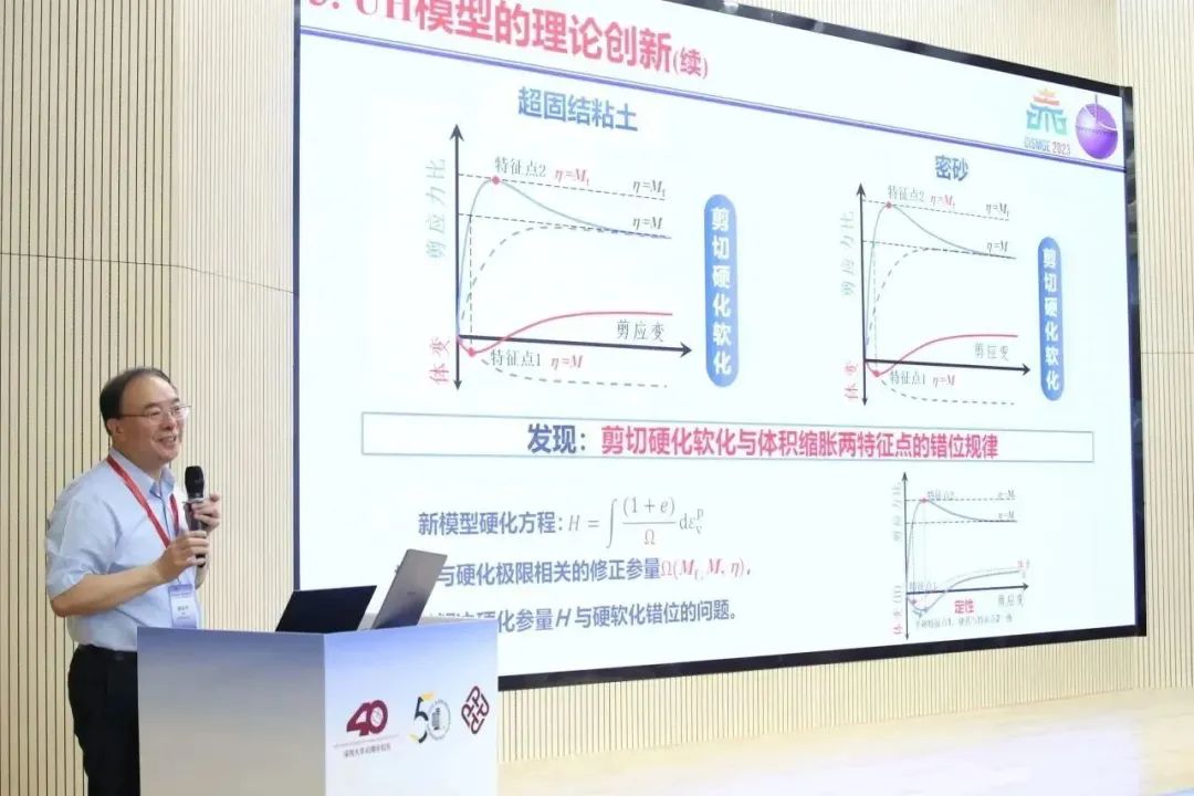 开幕式后,会议进入学术报告环节。北京航空航天大学姚仰平教授作了题为《基于土的三大基本力学特性的UH模型》的学术报告,报告着重介绍UH模型的理论创新、工程应用等,并指出建立砂土黏土统一硬化本构模型(UH 模型),实现了剑桥学派奠基人Wroth-Houlsby所期待的“探索一个单一的模型,通过调整参数就能够适用于各种类型的土”。