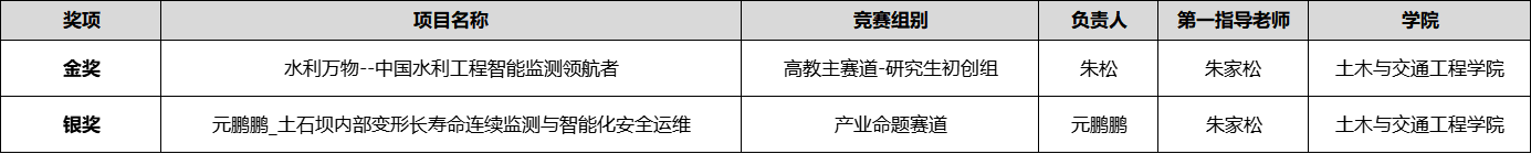 深圳大学共有13个项目从421万个参赛项目中脱颖而出晋级国赛总决赛,最终斩获3金6银4铜,刷新了深大在该项赛事历史最好纪录。其中,我院学院朱家松老师指导的《水利万物--中国水利工程智能监测领航者》与《横行坝道--土石坝内部变形智能监测与安全运维领航者》分别斩获金奖与银奖,实现我院在该项赛事国赛金奖、银奖零的突破,同时金奖数、奖项数高居全校并列第一!