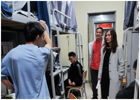 在宿舍走访过程中,副院长邹亮关心地询问了同学们的开学状态,亲切地与同学交流论文进度和求职情况。刘老师和张老师也积极鼓励同学们参与学校的各类招聘活动,为毕业早做准备。