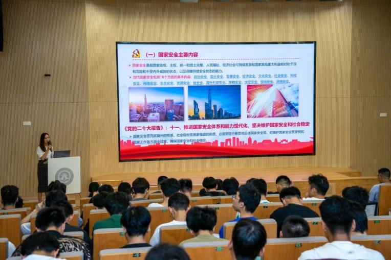 党委书记左英姿以俄乌战争、巴以冲突为切入点,分析了国内外的形势,引导学生认识中国和平发展的重要性;并通过分析四个反间防谍的典型案例,呼吁青年学生在日常生活中要提高国家安全意识,共筑国家安全的钢铁长城。