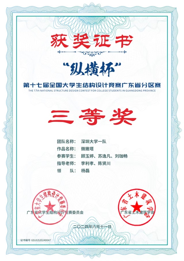 6月2日,2024年广东省大学生结构设计竞赛暨第十七届全国大学生结构设计竞赛广东分区赛在佛山科技学院圆满落幕。由我院杨磊副院长和熊琛老师带队,李利孝、陈铖、陈贤川、袁方老师共同指导,我校学生刘珈畅、苏逸凡、顾玉婷组成的“QCNT队”最终获得三等奖;李嘉豪、钟润泽、黄涛组成的“团结屯竹屑生产大队”与刘珈畅、苏逸凡、顾玉婷组成的“QCNT队”最终从54支参赛队中脱颖而出,分别获得一等奖与三等奖的好成绩,成功晋级全国总决赛!