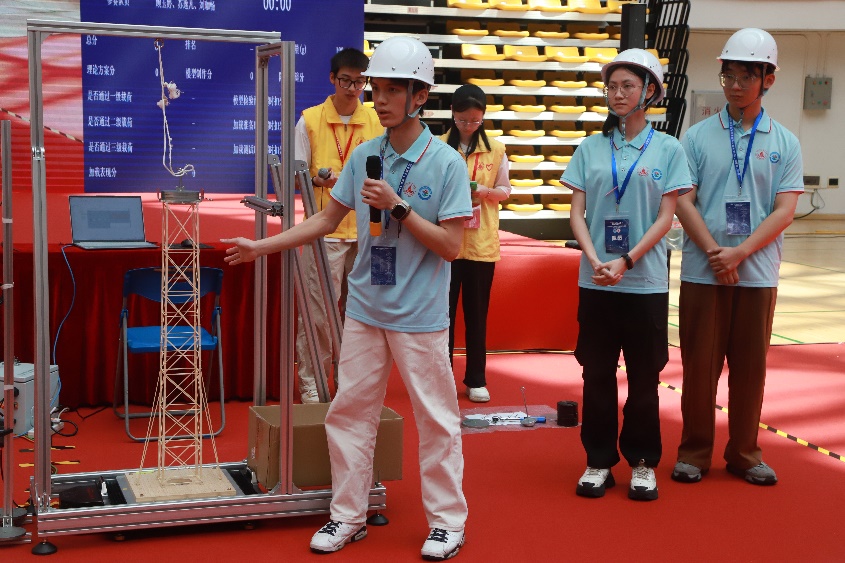 此次赛题为高耸塔式模型结构制作,以竹皮作为材料。整个比赛过程包括12个小时的模型制作以及一整天的模型加载,经过三天的激烈角逐,最终我校作品成功完成了模型制作并承受了全部荷载与水平震动干扰作用,完美地完成了比赛。
