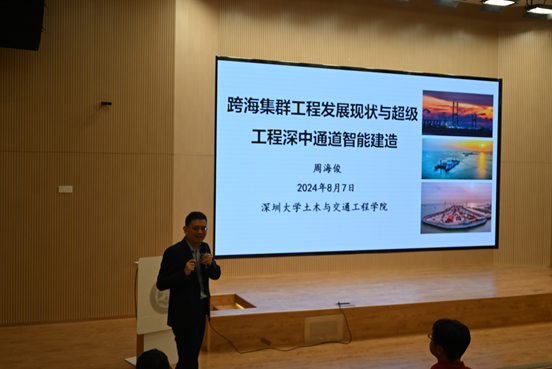 周海俊主任以我院多个科研团队参与深中通道这一超级工程为契机,做了“跨海集群工程发展现状与超级工程深中通道智能建造”的科研讲座。讲座中涉及如沉管隧道建设、北斗导航技术精准对接安装沉管、智能检监测与灾害防控系统构架组建等内容。