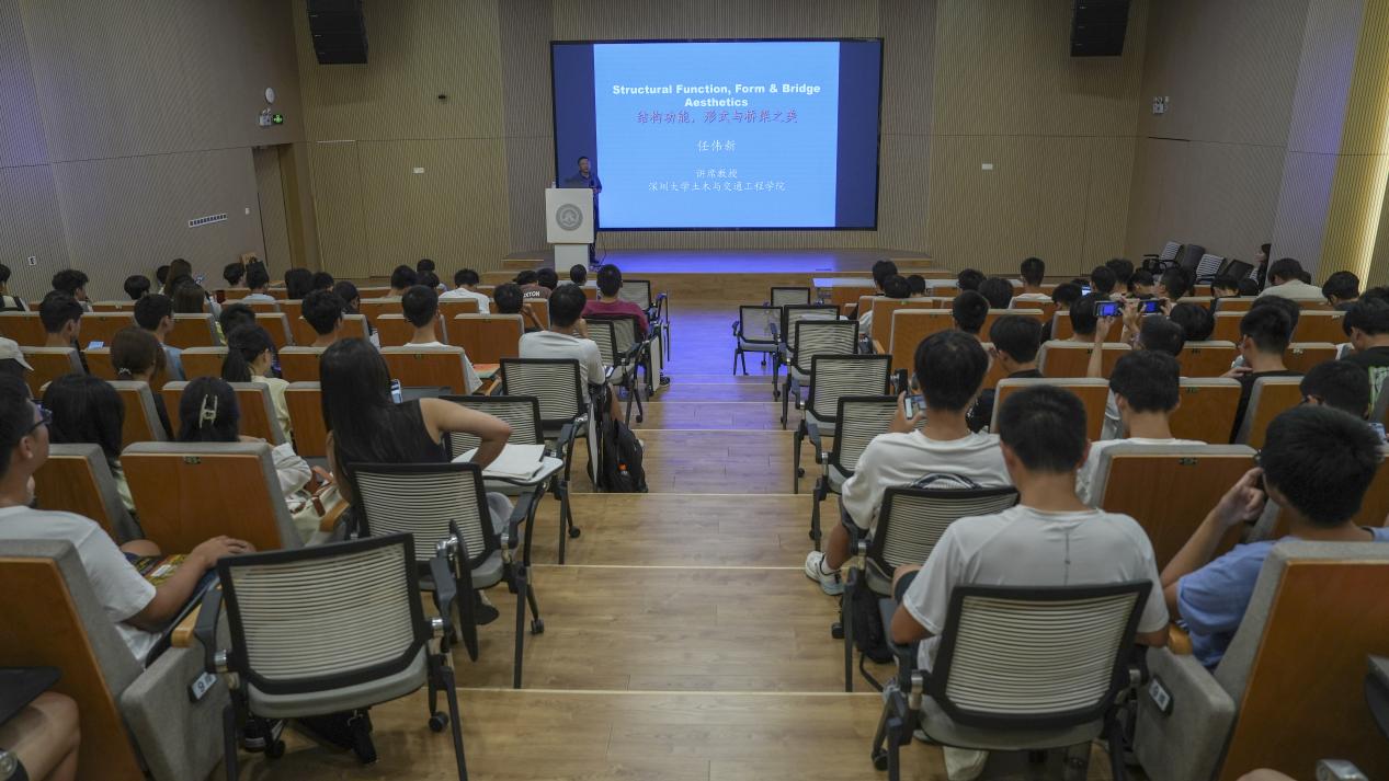 2024年10月17日晚19:00,我院任伟新教授进行了主题为《结构功能,形式与桥梁之美》的专题讲座。学院土木工程系主任周海俊教授、青年教师代表和全体200多名2024级新生参加并听取了报告,讲座由系主任周海俊教授主持。