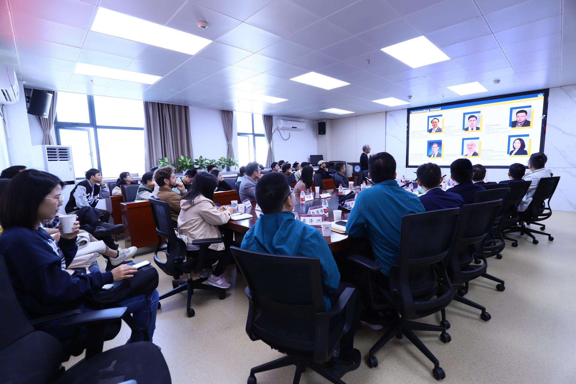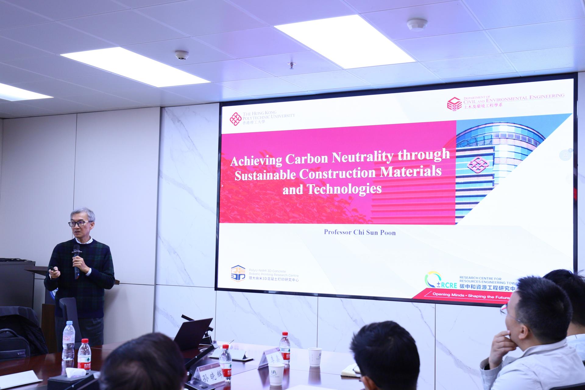 潘智生教授首先介绍了香港理工大学土木及环境工程学系的发展历史、组织架构、研究方向与研究条件,并分别介绍了本科、硕士、博士项目设置与奖学金申请。随后,潘教授作了题为《Achieving carbon neutrality through sustainable construction materials and technology》的学术报告。