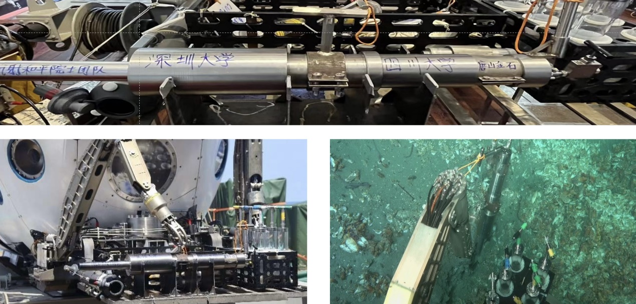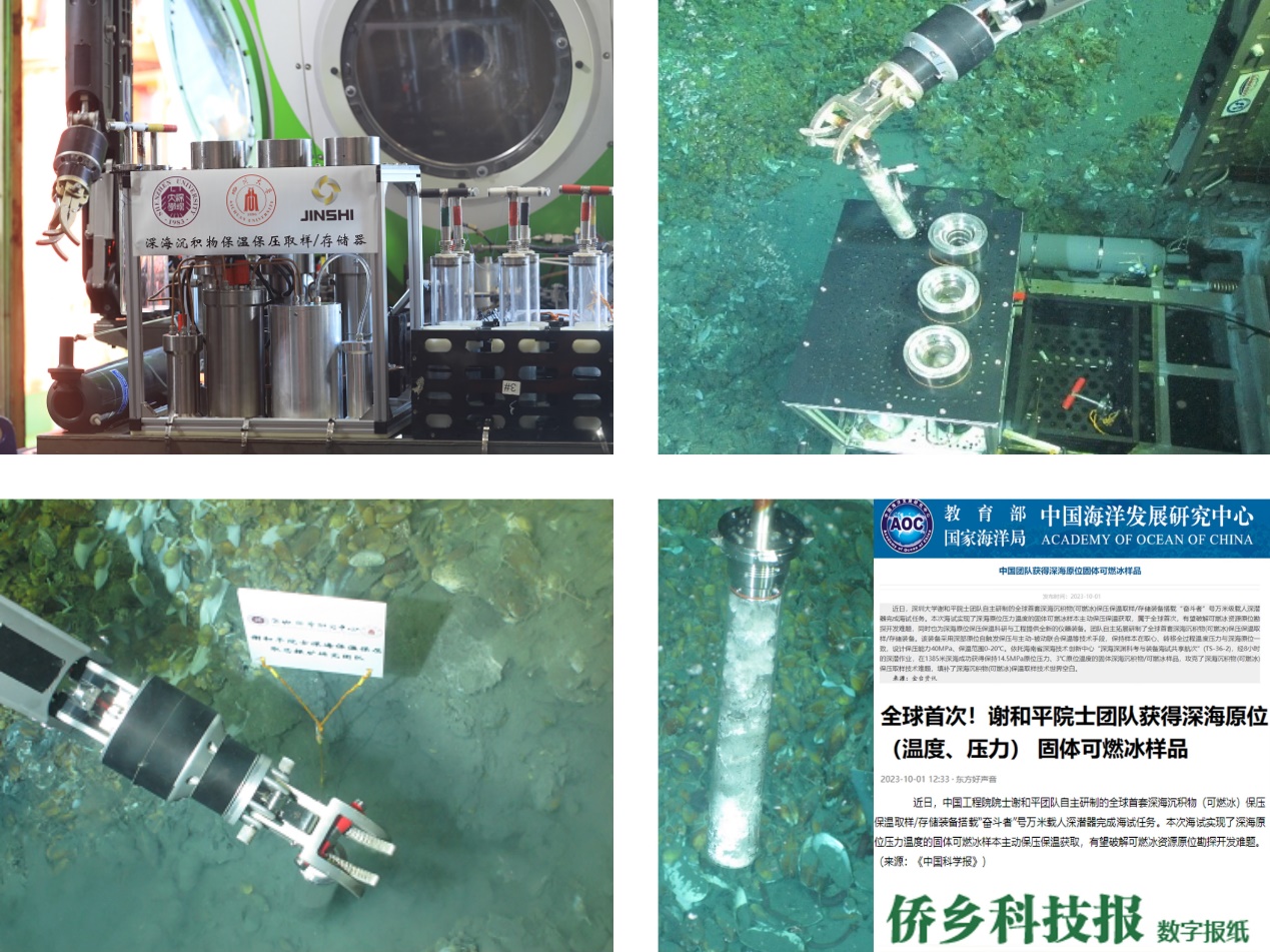 针对深海可燃冰/沉积物原位保压保温取芯存储与样品物理力学参数保真测试的国际难题,谢和平院士团队创新研制了深海可燃冰/沉积物保压保温取芯存储与测试关键技术及装备,自主研制了全球首套基于深潜器与钻井平台的深海保压保温取芯与存储技术装备,实现了深海原位压力温度的固体可燃冰样本主动保压保温获取全球零的突破。2022年9月23日,搭载探索二号科考船4500米级“深海勇士”号深潜器,在南海海马冷泉1370米水深区域完成多点位保压保温取样作业,在国际上首次获得保持原位压力13.8MPa、温度6.51℃的深海可燃冰样品。2023年9月27日,搭载探索一号科考船万米级“奋斗者”号深潜器,在我国南海海马冷泉1385m水深区域,首次获取了保持14.5MPa原位压力、3℃原位温度的固体深海沉积物/可燃冰样品。中央电视台、中国科学报、科学网、香港商报等多家国内外媒体报道了这一重大成果。同时,应用该技术发现了深海可燃冰/沉积物中微生物的新种及基因资源,为探索深海生命新奥秘提供新认识!