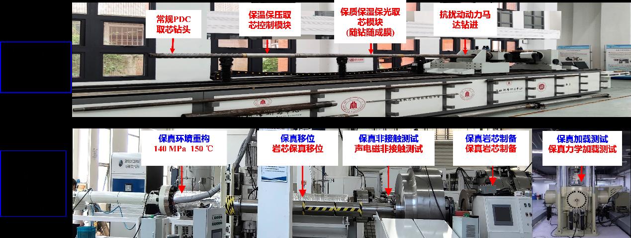 针对深部原位岩芯本真参数原位获取(相当于取地球“活体”样本)的技术空白,谢和平院士团队首创了原位自触发保压取芯技术构想与“主动+被动”保温相结合的保压保温取芯全新原理,原创性提出“保质、保湿、保光”取芯与“随钻随成膜”的颠覆性原理与技术,攻克了深部原位随钻成膜技术难题,填补了深部原位保质保湿保光取芯的技术空白。自主研制了全球首个1:1全尺寸深部原位五保取芯率定与模拟分析平台,填补了不同深度原位环境物理力学参数模拟测试与率定的技术空白。