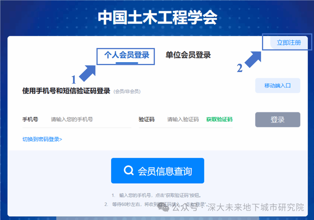 2、点击“单位会员登录”/“个人会员登录”选项后,再点击右上角“立即注册”选项,进入单位会员/个人会员入会须知。