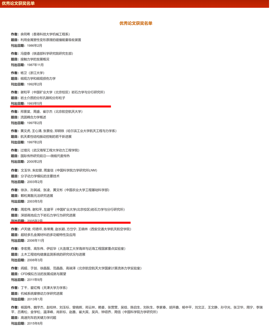 近日,《力学进展》举办了创刊50周年优秀论文评选活动,遴选出了创刊50周年来15篇优秀论文,谢和平院士团队2篇论文入选(谢和平,岩土介质的分形孔隙和分形粒子.力学进展,1993, 23(2): 145-164、周宏伟、谢和平等,深部高地应力下岩石力学行为研究进展. 力学进展,2005, 35(1): 91-99)。2篇论文分别对分形岩石力学和深部岩石力学的研究现状和未来研究方向进行了系统阐述。《力学进展》是由中国科学院主管,中国科学院力学研究所和中国力学学会联合主办的综合性学术期刊,是我国力学领域权威的综述评论性学术刊物。