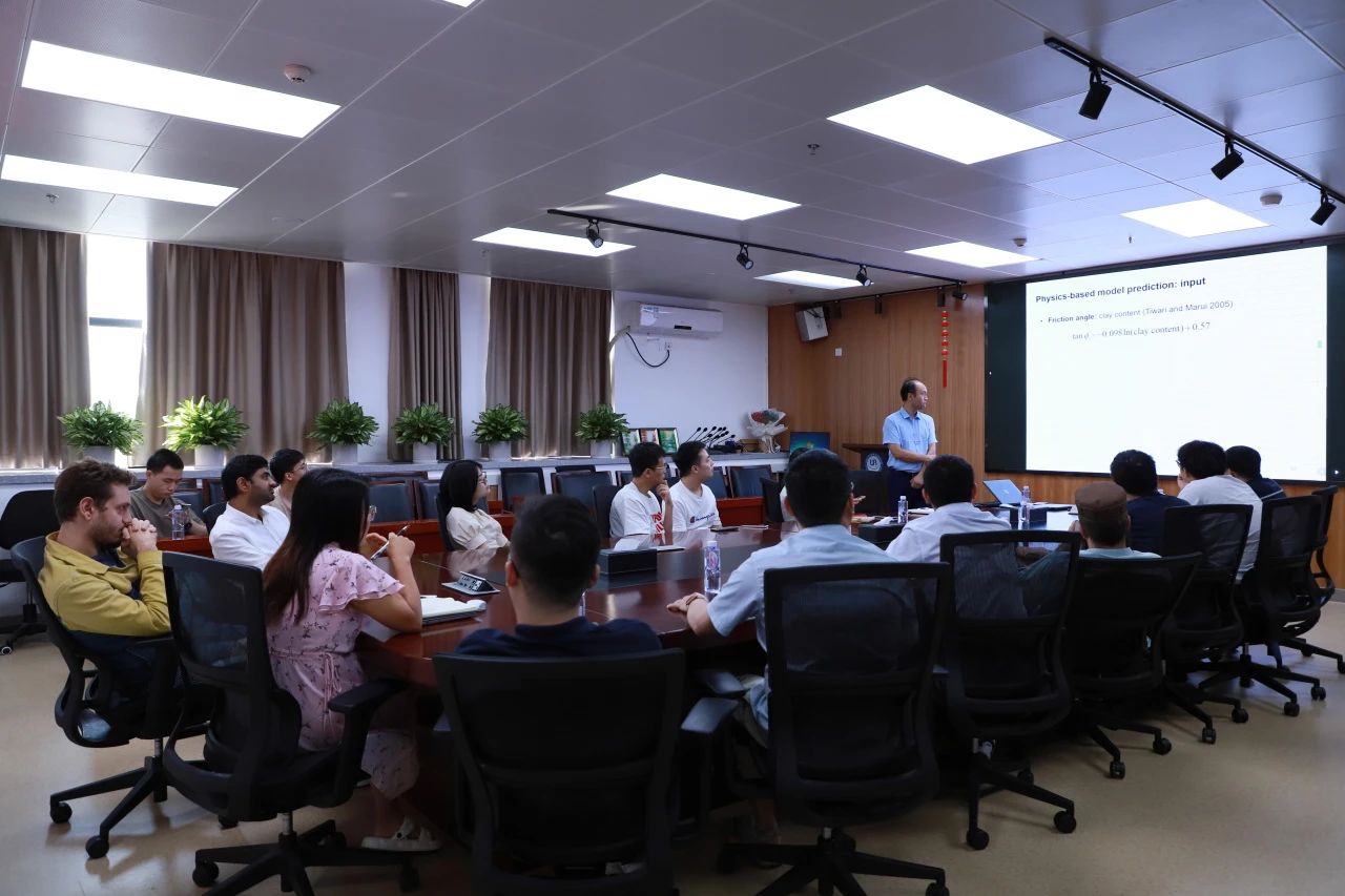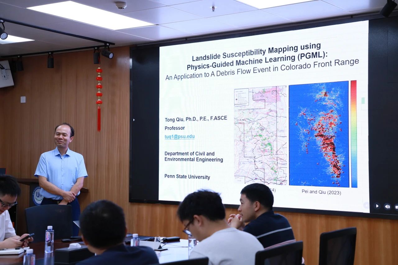 王树英教授首先对邱统教授的到来表示热烈欢迎。邱统教授作了题为《Landslide Susceptibility Mapping using Physics-Guided Machine Learning (PGML): An Application to A Debris Flow Event in Colorado Front Range》的学术报告。