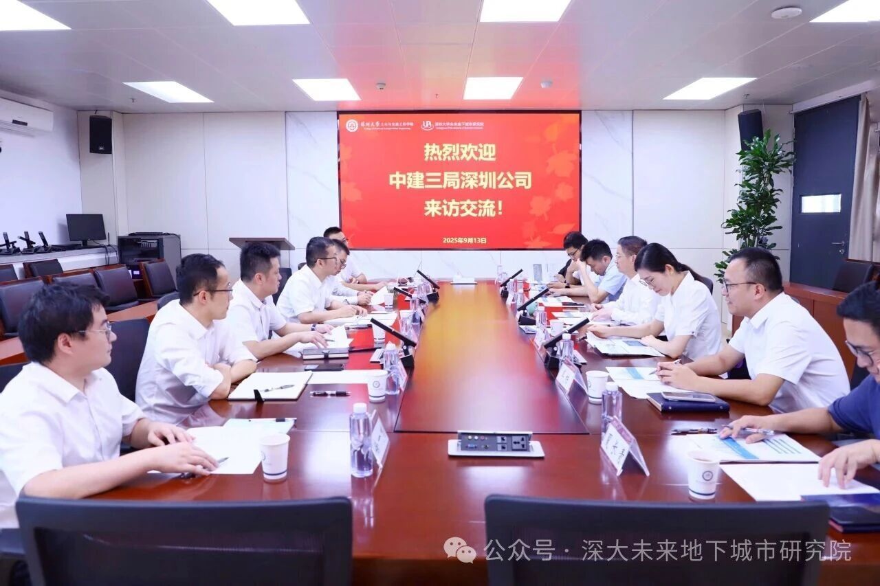 2025年9月13日下午,中建三局集团(深圳)有限公司设计与技术管理部负责人刘晓鸿、一公司总工程师王文斌、基础设施公司总工程师李陆华等一行来我院访问交流。深圳大学土木与交通工程学院及未来地下城市研究院院长陈湘生院士、副院长包小华教授以及相关专业教师参加此次座谈交流会,本次会议在粤海校区(南区)致理楼1007会议室开展。