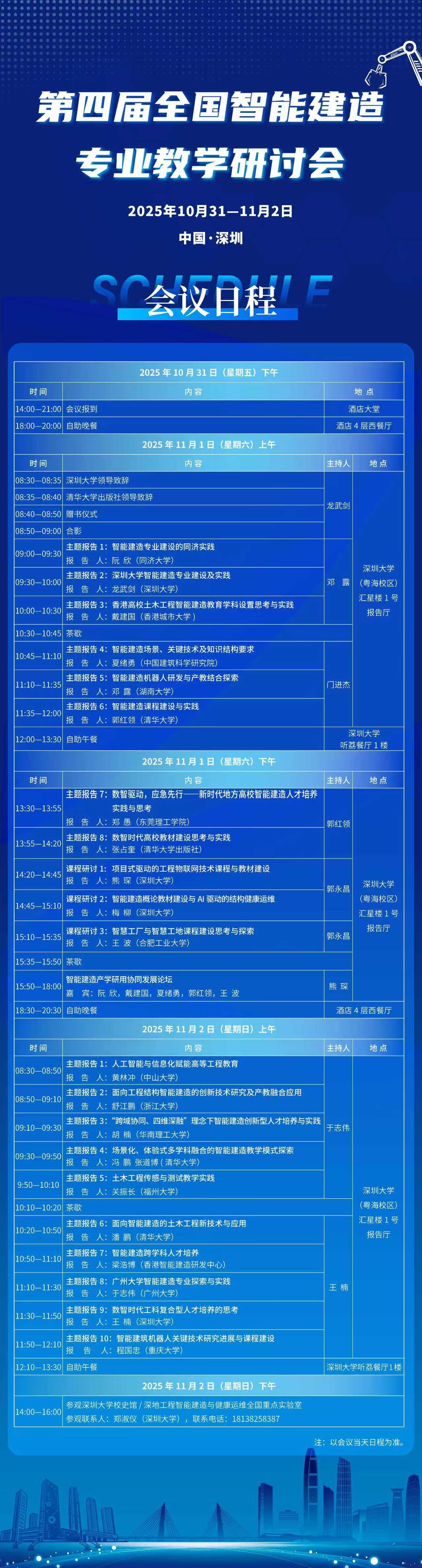 为汇聚各方智慧,共同商讨解决专业建设中的难点和痛点,进一步推动智能建造专业教育高质量发展,深圳大学携手清华大学出版社特举办第四届全国智能建造专业教学研讨会。本次会议将围绕智能建造专业和行业发展、课程体系建设、实践教学模式创新、跨学科人才培养及产学研用协同发展等主题展开深入探讨,围绕智能建造概论、工程物联网技术、智慧工厂与智慧工地等课程教学内容进行分享。