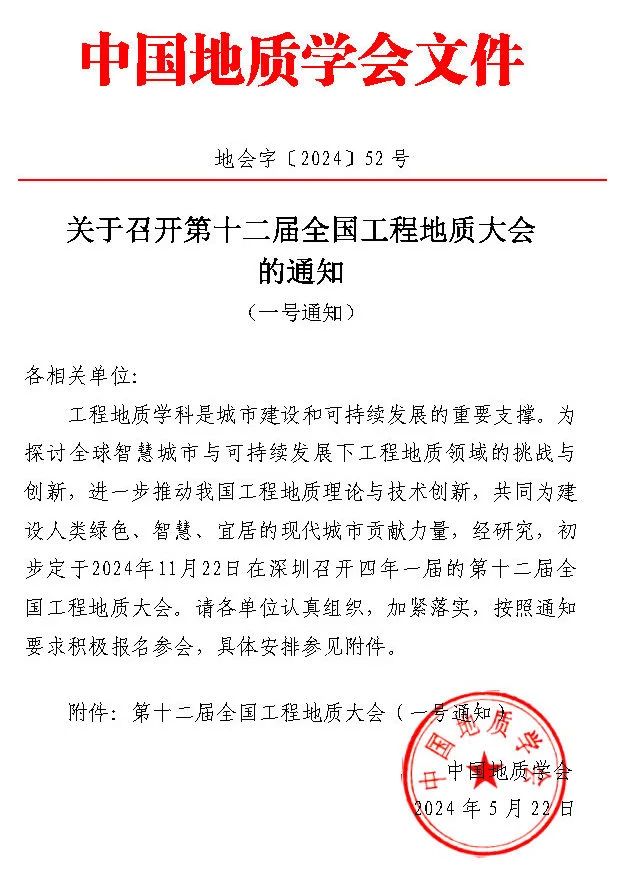 秋意融融,相聚鹏城,第十二届全国工程地质大会于 2024年11月22日至26日在深圳隆重召开。本次盛会由中国地质学会主办,中国地质学会工程地质专业委员会和深圳大学承办,国家自然科学基金委员会等多家单位协办。
