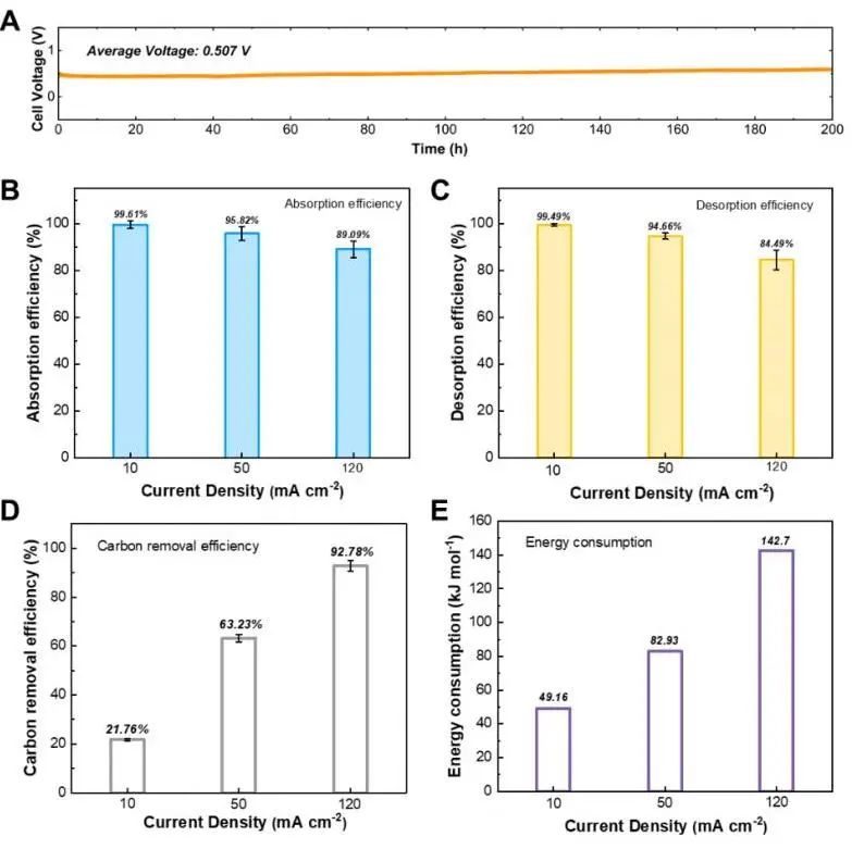 A、200小时稳定性测试;B、不同电流密度下吸收效率;C、不同电流密度下解吸效率;D、不同电流密度下系统碳移除率;E、不同电流密度下系统捕集能耗。
