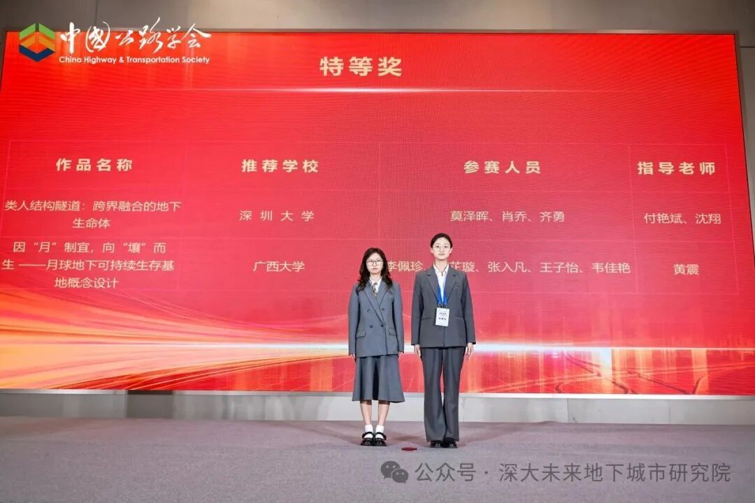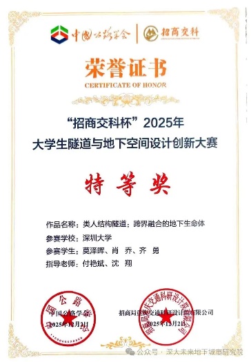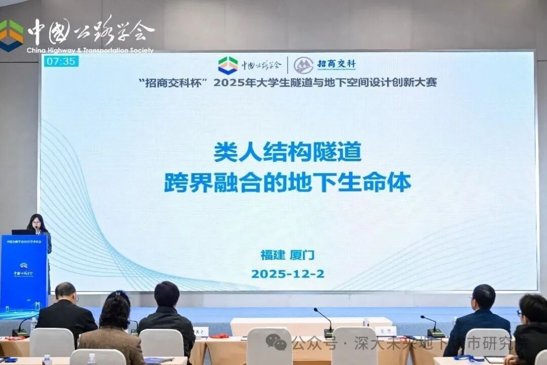 2025年12月2日,由中国公路学会与招商局重庆交通科研设计院有限公司联合主办的“招商交科杯”2025年大学生隧道与地下空间设计创新大赛全国总决赛在厦门圆满落幕。本次大赛以“未来隧道——跨界融合与无限想象”为主题,总决赛共有22支代表队参与角逐,包括同济大学、重庆大学、山东大学、东北大学,湖南大学,西南交通大学、中国矿业大学,长安大学在内的等22支国内知名高校的代表队同台竞技。经过激烈角逐,深圳大学土木与交通工程学院学生团队脱颖而出,荣获大赛最高奖项——特等奖,全国仅有两项作品获此殊荣。