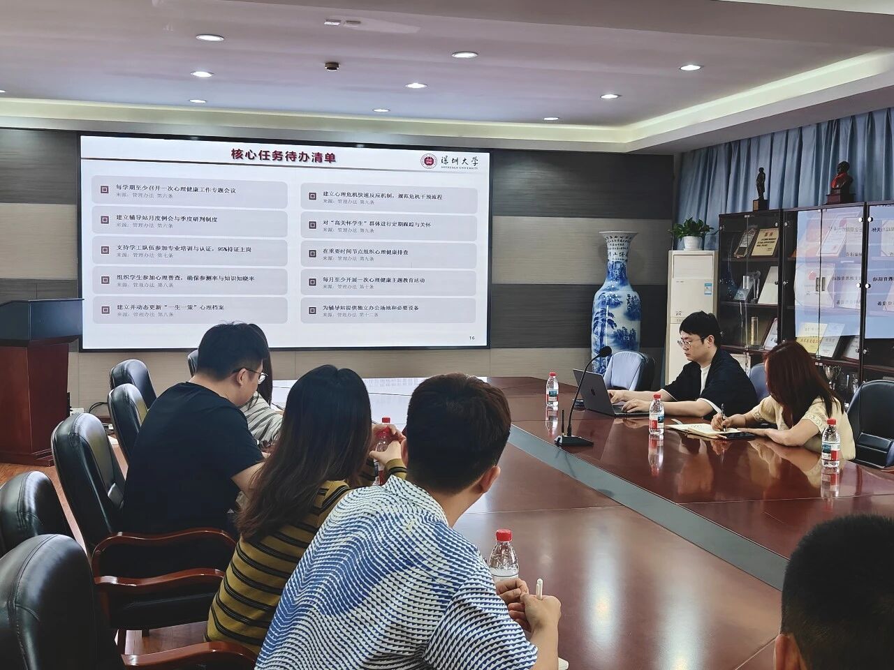 全体与会人员集体学习了《深圳大学心理辅导站管理办法(修订稿)》,逐条梳理辅导站组织架构、队伍建设、工作制度及考核评价等内容,进一步明确心理育人工作规范与职责要求。随后,全体辅导员依次汇报分管高关怀学生情况,并展开深入讨论,集思广益提出针对性帮扶建议。