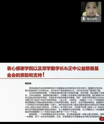 陈碧霞副书记对此次海外访学项目做了介绍和说明。她说,邓学勤校友连续17年反哺母校,从2003年起捐资每年10万元至2019年每年50万,17年不间断的捐资,累计总额达400万元,已资助1811人次,这些数字着实令人感动!如何将邓总的这份沉甸甸的爱心和善举切实落地,作为学院学生工作负责人,倍感责任重大。经过调研和探讨,自去年起,对正中关爱基金的资助方案进行修订和完善,对贫困学生的资助分为基础型需求资助和发展型需求资助。此次赴日海外访学,是新方案启动后首次试水。听完同学们的分享,她感到欣慰,认为新方案的探索方向是正确的,对今后如何切实推进资助工作有了信心。