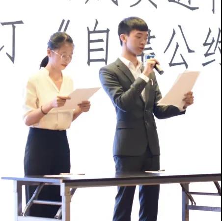 当选为第十五届学生会主席团成员的江俊同学和梁燕媚同学上台进行履职宣誓,并签订《自律公约》。