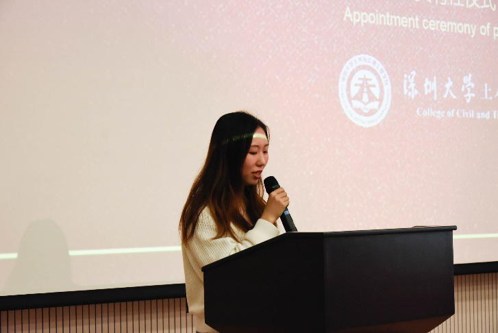 兼职辅导员唐仕盈同学发言,她代表全体兼职辅导员团队表达了努力做好兼职辅导员工作的决心,她说:“兼职辅导员这份工作,对于我们来说充满了新奇与诱惑,也充满了挑战。我们愿意付出努力,为学院学生工作贡献力量。”